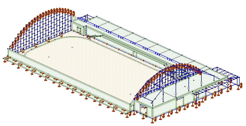 Projekt specifikum: A jégkorong pálya acél dongaíves csarnokfedéssel (íves héjszerkezettel) került lehatárolásra.